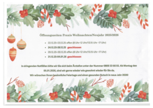 Montag 22.12.2025 und Dienstag 23.12.2025 sowie Montag 29.12.2025 und Dienstag 30.12.2025 an allen anderen Tagen bleibt die Praxis ganztägig geschlossen.